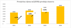 Prosječna tražena cijena kvadrata stana u 2024. godini iznosila je 3.543 eura što je rast od 12,66% u odnosu na prosječno traženih 3.145 € u 2023. godini. Usporedno s 2022. kada je prosječna tražena cijena iznosila 2.658 eura po kvadratu stana rast je značajnih 33,3 posto.