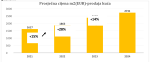 Kvadrati kuća u posljednje vrijeme sve su popularniji, a to pokazuje i uzlazni trend prosječnih traženih cijena kvadrata. U kategoriji kuća, sve županije bilježe rast traženih cijena, a prosjek traženog iznosa za kvadrat kuće u 2024. godini iznosio je 2.731 euro. Ovo predstavlja rast od 14,4% u odnosu na tražene cijene iz 2023. kada je za kvadrat u prosjeku traženo 2.387 eura.