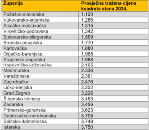 Najniže tražene cijene za kvadrat stana tijekom 2024. godine bile su u Požeško-slavonskoj, Vukovarsko-srijemskoj i Sisačko-moslavačkoj županiji.