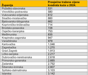 U čak 11 županija Hrvatske za kvadrat kuće traži se manje od 1000 eura, a daleko najjeftiniji kvadrati mogli su se pronaći u Požeško-slavonskoj županiji iako ona bilježi jedan od viših postotnih skokova. U toj županiji u prosjeku se 2024. godine tražilo 531 €, dok je ta cijena 2023. bila 452 eura što je porast od 19 posto.