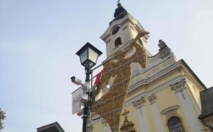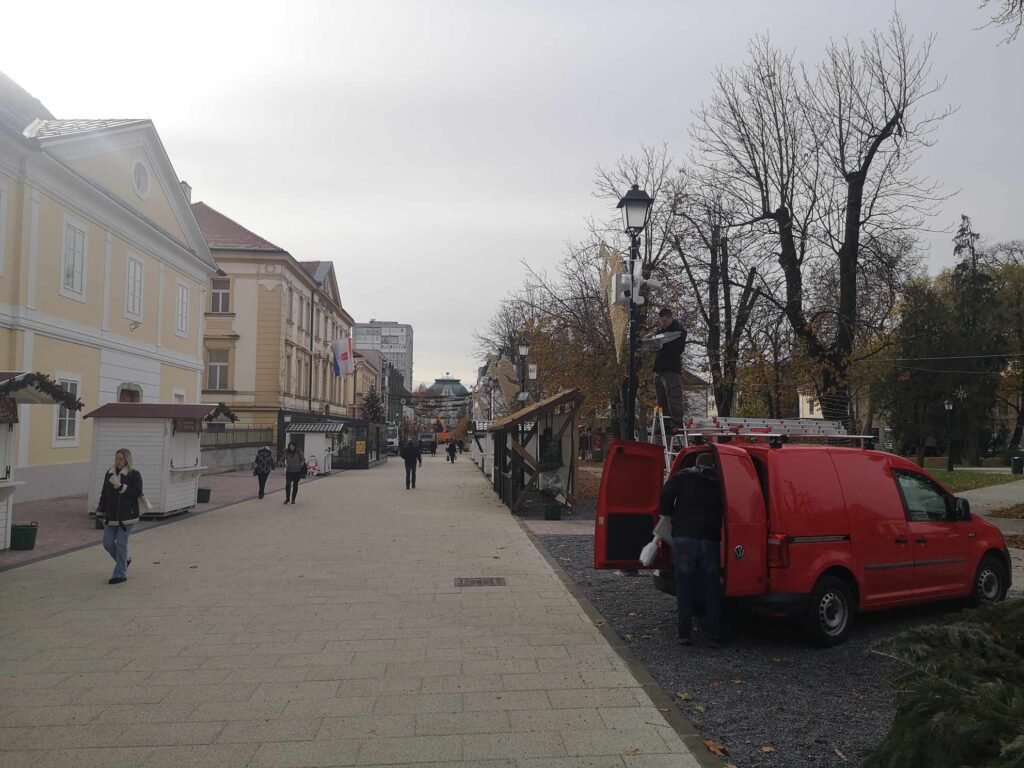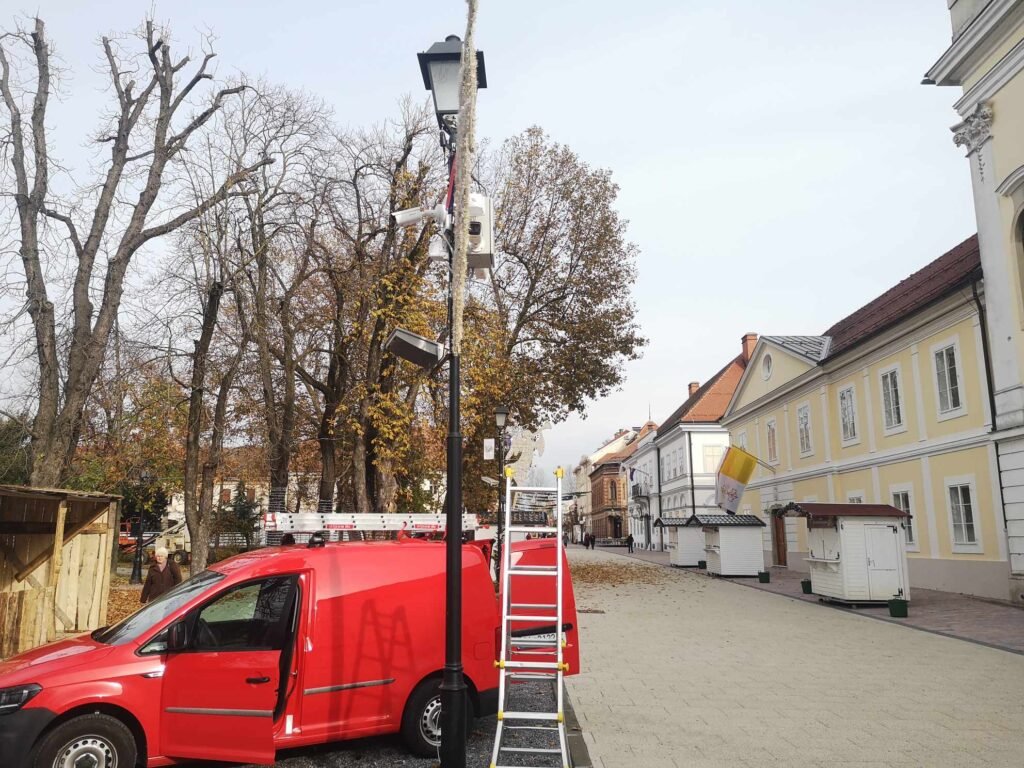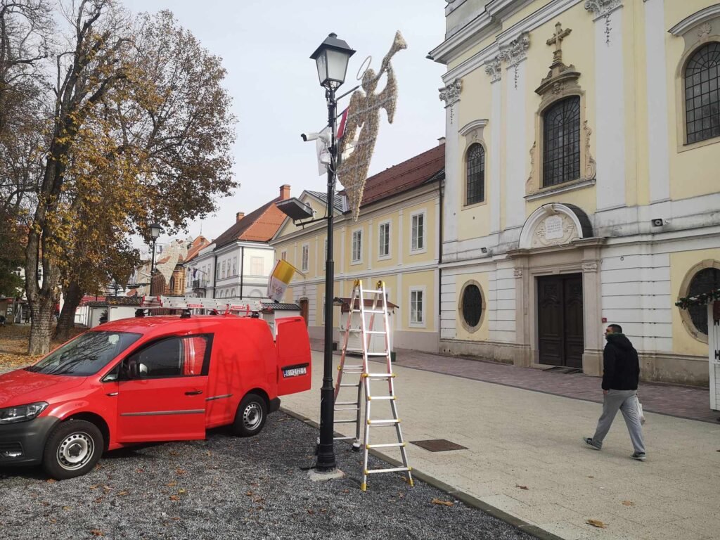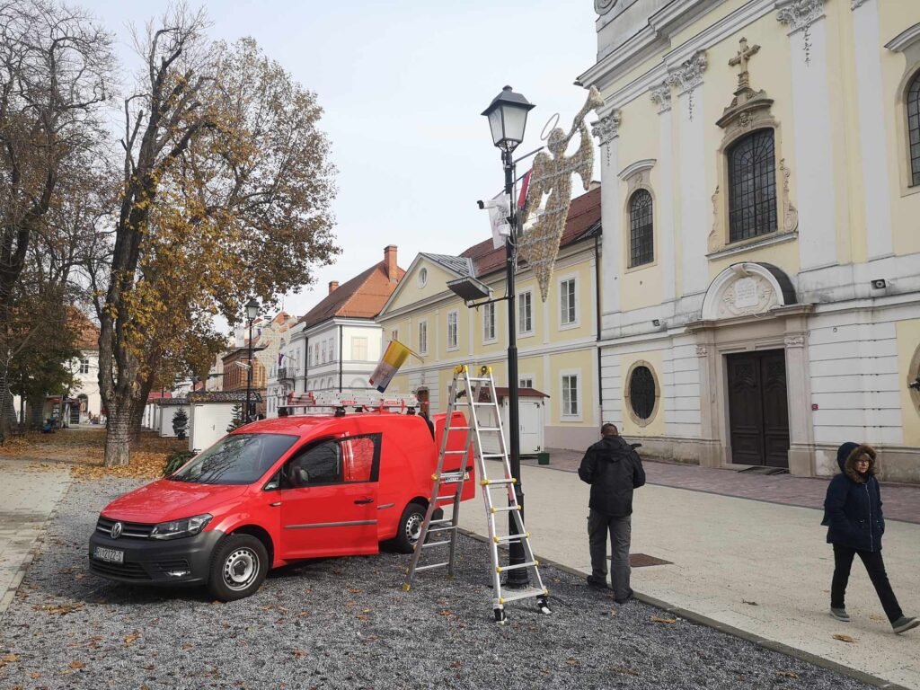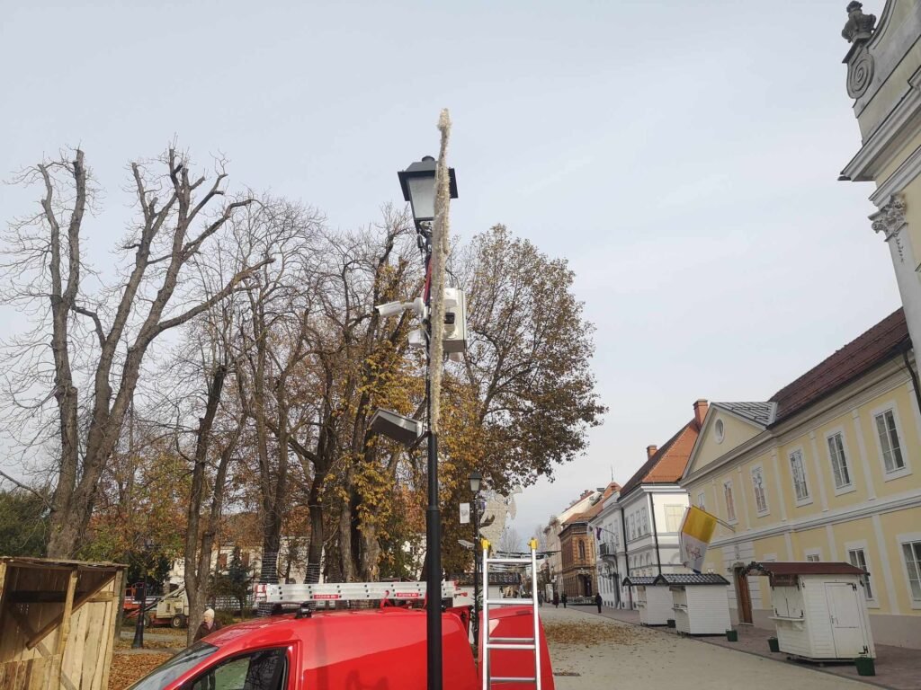 Montaža je, kao što možete vidjeti na fotografijama, započela na stupu električne rasvjete na korzu ispred katedrale sv. Terezije Avilske.