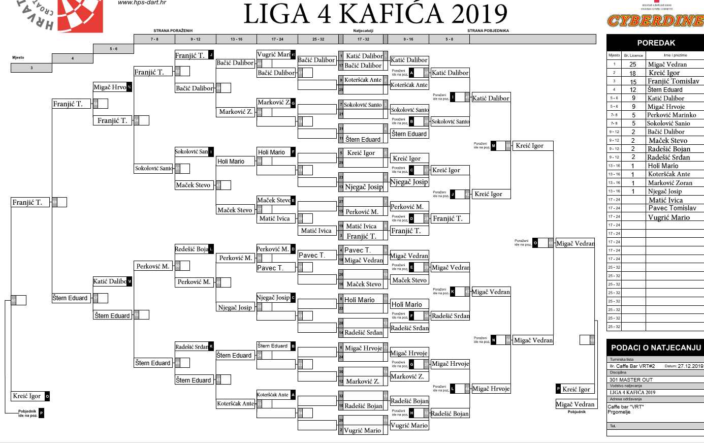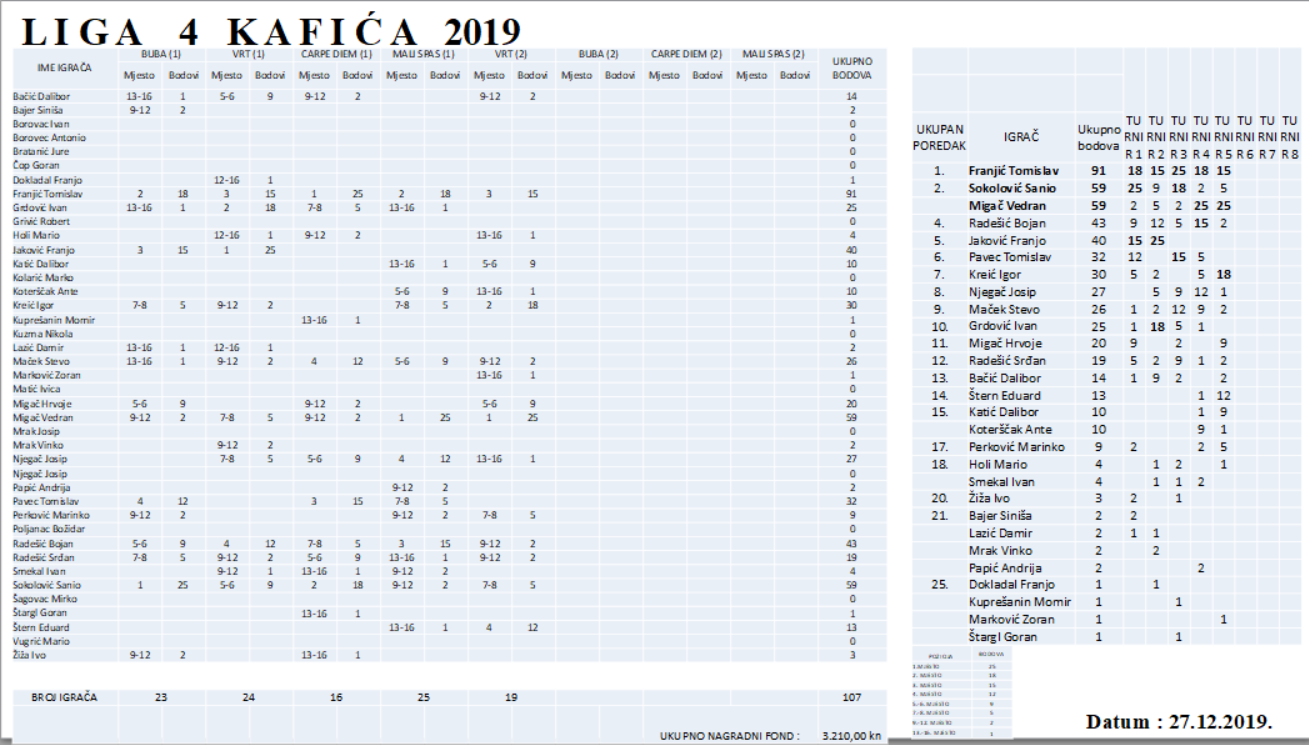 -Treba pohvaliti Igora jer je pobjedama nad jakim suparnicima, za povratak u finale pobijedio vodećeg u ukupnom poretku Franjića kojeg je i poslao na lijevu stranu. Franjić i dalje nastavlja sa dobrim igrama i s ovim trećim mjestom je povećao vodstvo na 32 boda u odnosu na Sania i Migača koji sada dijele drugo mjesto. Odličnu igru na ovom turniru imao je i Eduard Štern i uzeo četvrto mjesto sa 12 bodova što mu je poboljšalo ”krvnu sliku” u ukupnom poretku. Iznimno dobro igrali su Hrvoje Migač i Dalibor Katić sa diobom 5 do 6 mjesta, te Marinko Perković i Sanio koji su podijelili 7 i 8 mjesto. Po dva boda upisali su Bačić, Maček i braća Radešić. Da je teško do bodova pokazuje kako su po jedan uzeli Njegač, Koterščak, Marković i Holi. Malo iznenađenje je Pavec koji je propustio upisati bodove, no i dalje je odličan šesti u ukupnom poretku. Propuštanjem turnira pad na ljestvici dogodio se Jakoviću i Grdoviću. Do kraja su još tri turnira i bit će velika borba za ulazak u prvih deset koji će ići u završni turnir. Na svim turnirima do sada je ukupno sudjelovao 41 igrač, a bodove je uspjelo upisati njih 28 – kazao je Mario Holi, jedan do velikih zaljubljenika u pikado koji također sudjeluje na turniru.