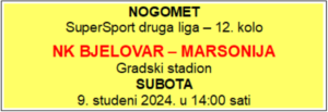 Pored tih gostovanja NK Bjelovar će u subotu, 9. studenog, biti domaćin na svom Gradskom stadionu. U 12. kolu ugostiti će Marsoniju iz Slavonskog Broda, momčad s dna tablice i momčad koja je u Bjelovar dolazi nakon prošlotjednog domaćeg poraza od Hrvatskog dragovoljca. Za NK Bjelovar ovo će biti sjajna prilika za šestu prvenstvenu pobjedu kojom bi održao priključak s vodećima na tablici.