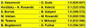 U prvom bloku Darko Kasumović je unatoč više srušenih čunjeva izgubio meč od Dude na setove, a poraz je upisao i dvojac Horžitzky – Nikola Rosandić od kojih je bolji bio Kelečić.