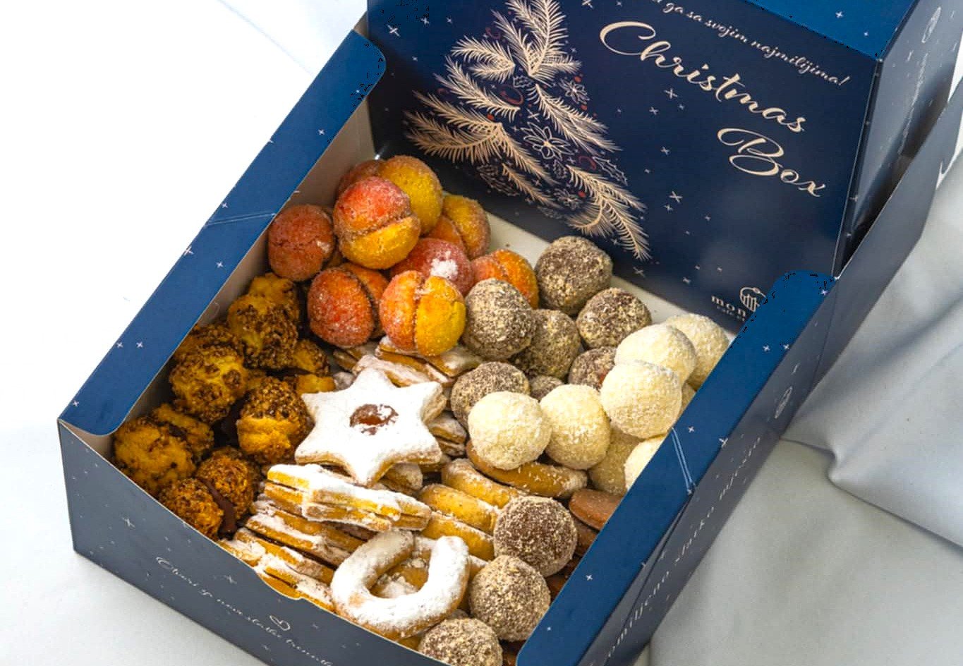 U ponudi je njihov popularni Christmas Box, idealan kao poklon vašim najmilijima. Box je težak jedan kilogram i sadrži razne slastice: linzere, krešente, breskvice, medenjake, kokos kuglice, plazma kuglice i vanil kiflice.