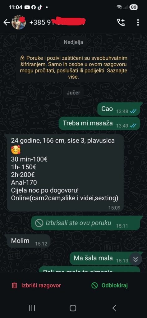 – Partner s kojim imam zajedničko dijete, ali više nismo u vezi, ostavio je slučajno otključan mobitel. Vidjela sam oglas za masažu i nešto posumnjala te se javila porukom za termin masaže. Odmah sam povratno dobila cjenik usluga za prostituciju koja se obavlja u središtu Bjelovara. Malo je reći da sam ostala u šoku… Mobitel sam mu pogledala jer sam posumnjala da novac troši na sve, samo ne na naše zajedničko dijete koje zakonom treba pomagati – iskrena je čitateljica.
