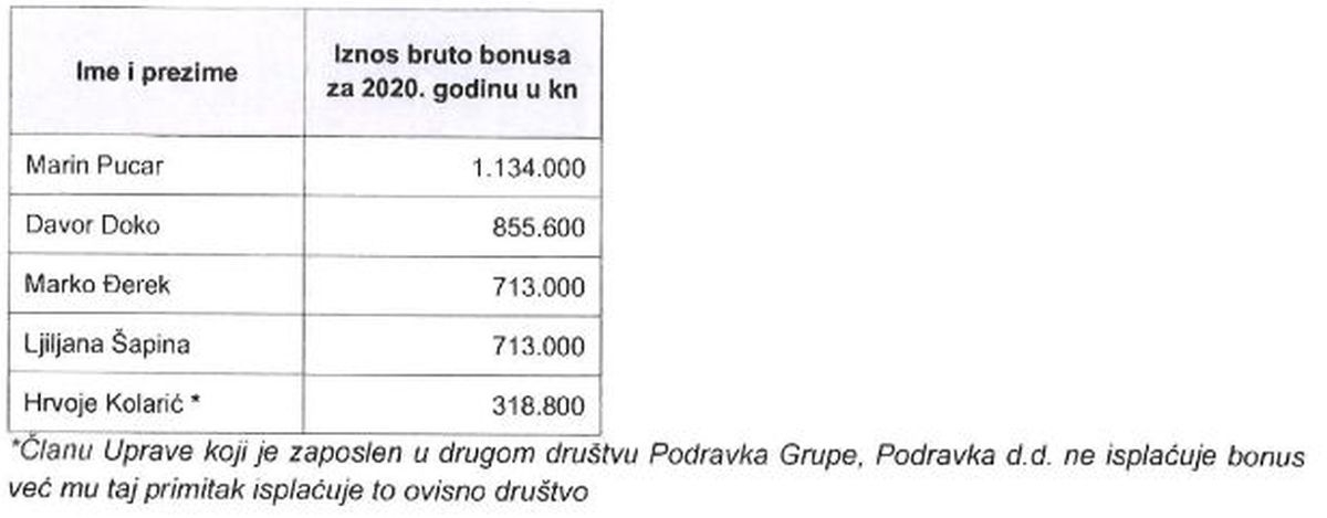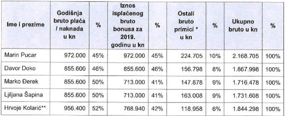 Ni ostali članovi Uprave nisu loše prošli. Davor Doko primio je 1.8 milijuna kuna na ime bruto plaće i naknada te 855.600 bruto bonusa. Marko Đerek primio je 713 tisuća kuna bruto bonusa, a na ime plaće 1.7 milijuna kuna. Iste iznose primila je i Ljiljana Šapina. Hrvoje Kolarić primio je 1.8 milijuna kuna te 318 tisuća kuna bruto bonusa. Svi su ostvarili pravo na dionice. To znači da članovi Uprave na ime plaće primaju mjesečno od 80 do 100 tisuća kuna neto, a predsjednik Uprave oko 110 tisuća kuna neto. Na to sve treba računati i bonuse.