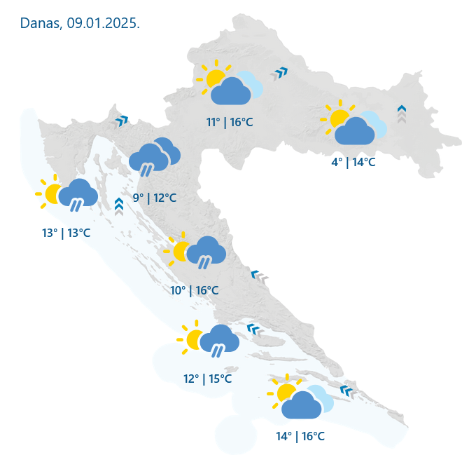 Prema prognozi Državnog hidrometeorološkog zavoda, Hrvatsku danas očekuje promjenjivo i iznadprosječno toplo vrijeme za ovo doba godine. Na Jadranu i uz obalu povremeno će padati kiša, a navečer se oborine očekuju i u unutrašnjosti. Puhat će umjeren do jak jugozapadni i južni vjetar, dok će na Jadranu prevladavati jugo. Najviša dnevna temperatura kretat će se između 11 i 16 °C.