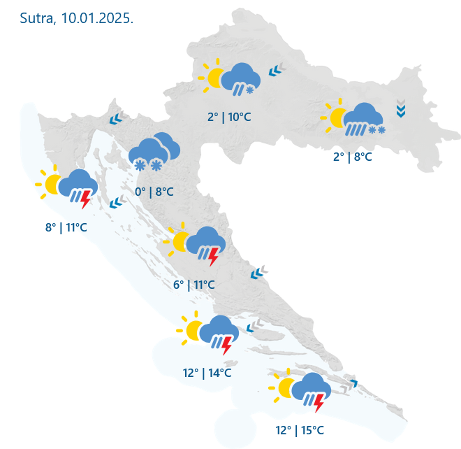 Na Jadranu će jutro donijeti kišu i grmljavinske pljuskove, najprije na sjeveru, a zatim i u Dalmaciji. Vjetar će se tijekom noći i jutra naglo okrenuti na sjeverni i sjeveroistočni smjer te će mjestimice biti olujne jačine. Na moru će zapuhati jaka bura koja će se tijekom dana proširiti na cijelu obalu.