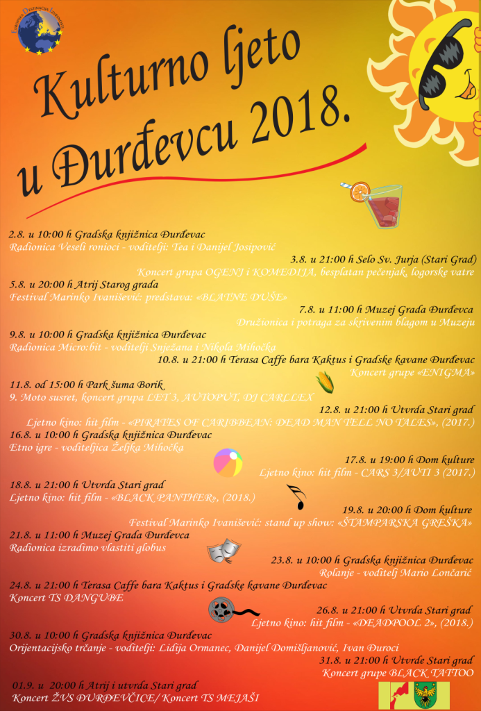 Zatim slijedi festival Marinko Ivanišević u sklopu kojeg će gledatelji moći uživati u stand up showu Štamparska greška, radionica Muzeja grada Đurđevca pod nazivom Izradimo vlastiti globus te rolanje pod vodstvom Marija Lončarića u organizaciji Gradske knjižnice Đurđevac. Potom ćslijedi koncert TS Danguba, te orijentacijsko trčanje u organizaciji Gradske knjižnice Đurđevac.Kraj kulturnog ljeta obilježit će koncerti grupe Black tattoo, Đurđevčica i Mejaša.