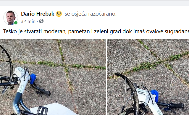 Gradonačelnik je napisao ”Teško je stvarati moderan, pametan i zeleni grad dok imaš ovakve sugrađane”, misleći pritom na štetu koju je počinio nepoznati počinitelj na punionici za električne bicikle. Konkretno, punionicu koja je smještena kod Dvorane europskih prvaka na Poljani dr. Franje Tuđmana.