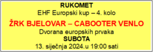 Uzvratna utakmica između Cabooter Venlo i ŽRK Bjelovara igra se slijedeću nedjelju, 21. siječnja, u Nizozemskoj.