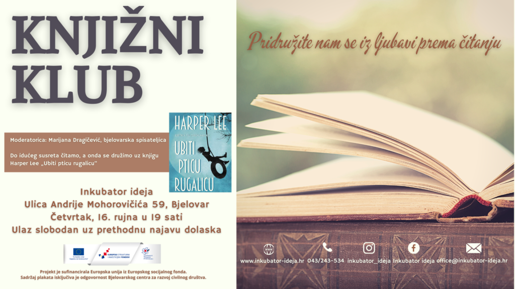 Tako se u četvrtak, 16. rujna, s početkom u 19 sati održava se peti susret Knjižnog kluba. Ovoga puta je na redu čitanje knjige spisateljice Harper Lee pod nazivom ”Ubiti pticu rugalicu” o kojoj će se razgovarati.