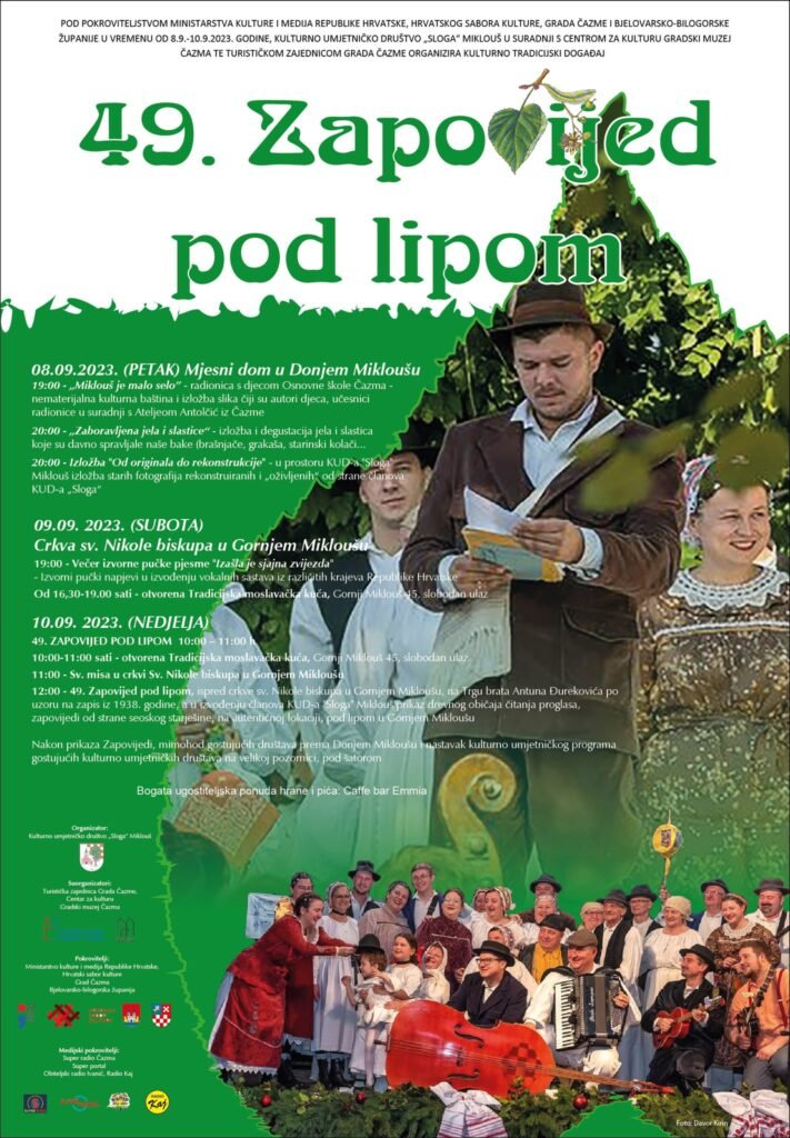 Ministarstvo kulture i medija, Uprava za zaštitu kulturne baštine, svojim Rješenjem od 6. listopada 2021. godine utvrdilo je da Običaj Zapovijedi pod lipom u Gornjem Mikloušu ima svojstvo nematerijalnog kulturnog dobra te je upisan u Registar kulturnih dobara Republike Hrvatske – Listu zaštićenih kulturnih dobara pod brojem Z – 7474.Ove godine, 49. manifestacija Zapovijed pod lipom održava se od 8. do 10. rujna u Mikloušu. Organizator je KUD „Sloga“ Miklouš u suradnji s Centrom za kulturu Čazma i Turističkom zajednicom grada Čazme. Pokrovitelji ovog događaja su Ministarstvo kulture i medija, Hrvatski sabor kulture, Bjelovarsko-bilogorska županija i Grad Čazma.(Bjlive)