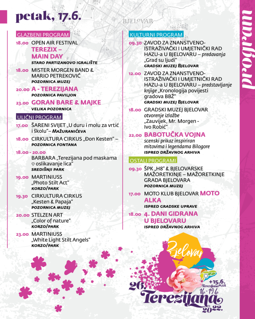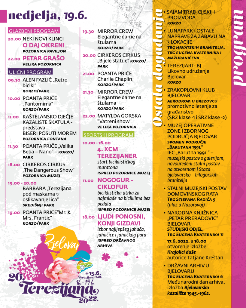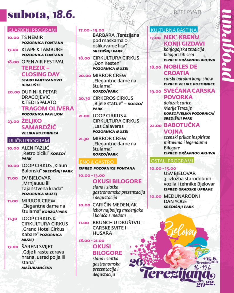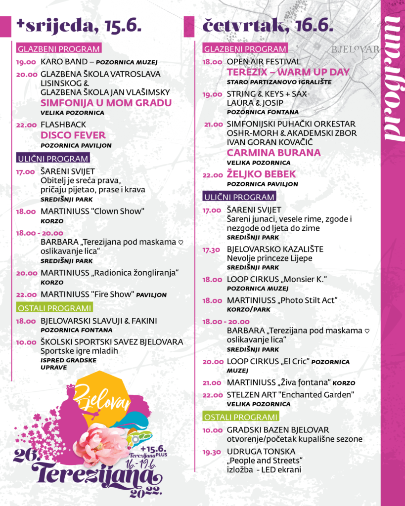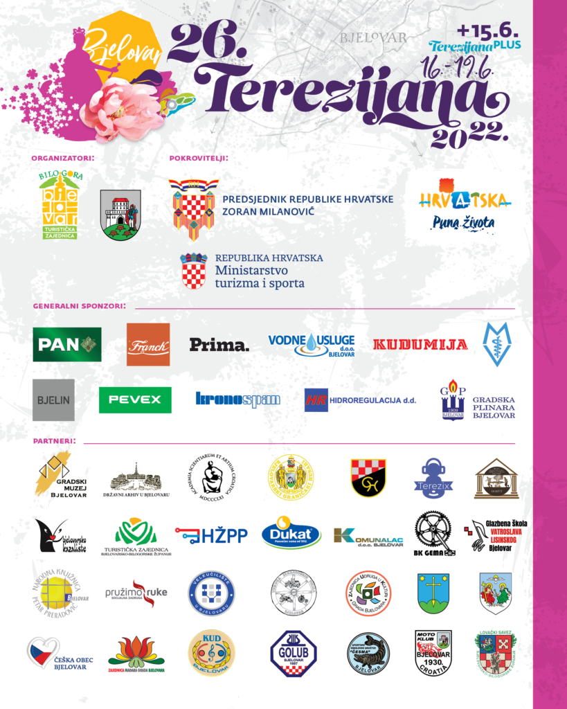 Dragi naši, u nastavku možete pogledati detaljan program 26. Terezijane, najzabavnije carske priče središnje Hrvatske koja će se održati od 16. do 19. lipnja u srcu Bjelovara. Ovogodišnja manifestacija nikada nije bila bogatija i nadamo se da će svatko pronaći nešto za sebe. Uživajte i vidimo se! (ika)