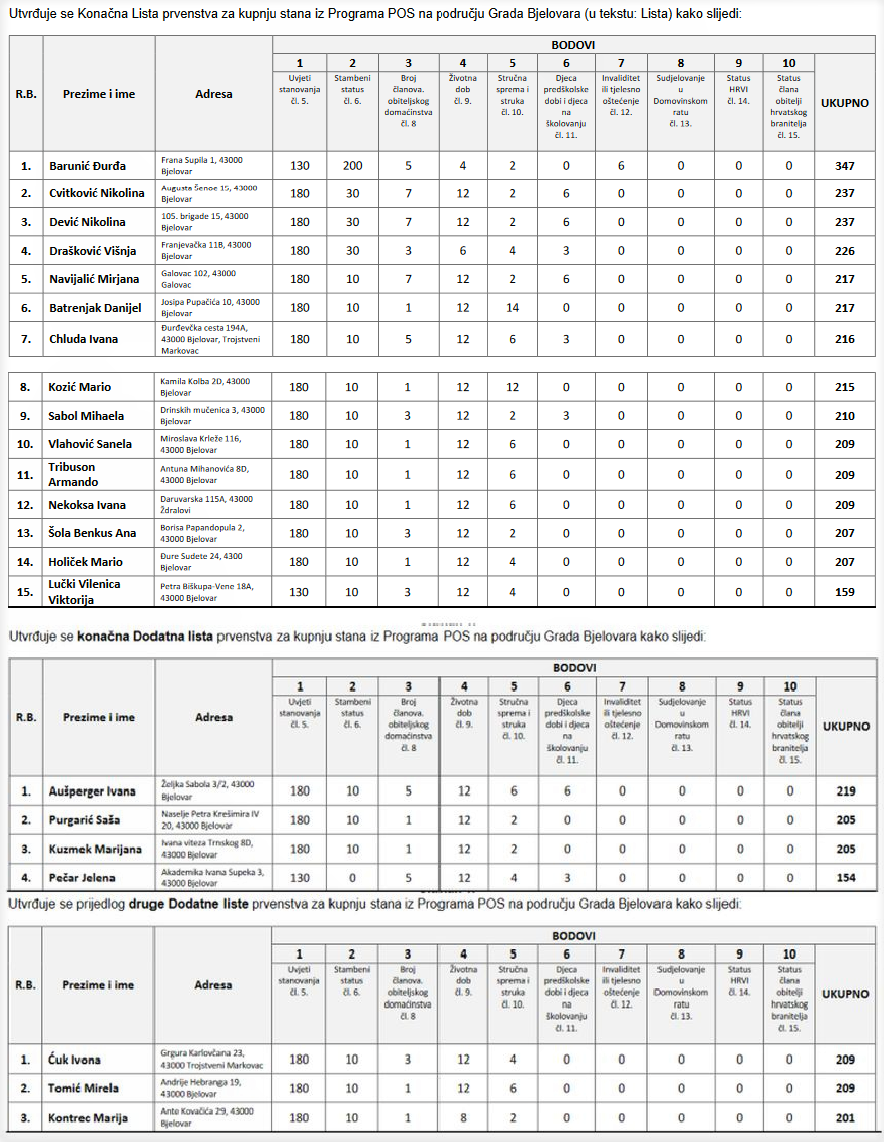 Poznat je prijedlog Konačne liste prvenstva za kupnju stana po programu društveno poticane stanogradnje. Podsjetimo, prvi javni poziv za iskazivanje interesa za kupovinu POS-ovih stanova Grad Bjelovar raspisao je još prošle godine. Odmah se javilo se ukupno 16 zainteresiranih. U međuvremenu je jedna osoba odustala, a trebalo je pronaći najmanje 22-oje zainteresiranih. Poziv je ubrzo ponovljen. Na prvoj Dodatnoj listi našle su se četiri, a na prijedlogu druge Dodatne liste tri osobe čime je privremeno zaključena potraga za novima stanarima. Zašto privremeno? Zato jer Grad mora ostaviti određeno vrijeme za eventualne žalbe na listu, a moguće je da APN koji subvencionira stambene kredite u međuvremenu također utvrdi određene nepravilnosti kod prijavitelja.