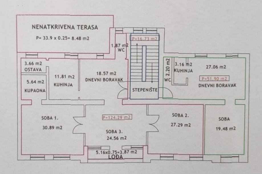 –Radi se o dva dnevna boravka, četiri sobe, dvije kupaonice, odnosno WC–a, kuhinje, ostave, balkona i velike terase. Secesijski luksuzni stan/zgrada u smislu prostora (visina stropova 3,60m) i pozicije. Nove vodovodne i plinske instalacije, novo krovište, snaga struje u stanu – 18KW. Suvlasnički odnosi uređeni – stoji u oglasniku koji možete pogledati ovdje. (ika)