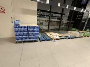 U Kauflandu je voda praktički ”presušila”, jer su zalihe rasprodane u kratkom roku. U Eurospinu je ostala tek jedna paleta, oko koje su se kupci neprestano zadržavali i uzimali posljednje pakete. Nešto bolja situacija zatečena je u Sparu, gdje su zaposlenici tijekom večeri morali dopremiti gotovo sve raspoložive količine iz skladišta kako bi barem djelomično popunili prazne police.