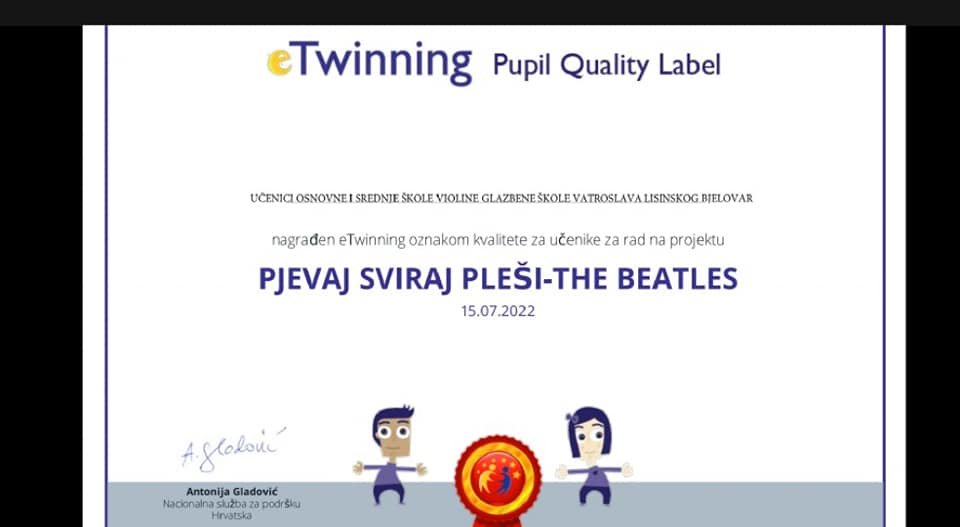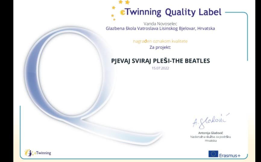 Glazbena škola Vatroslava Lisinskog u Bjelovaru dobila je prvu nacionalnu oznaku kvalitete u svojoj gotovo 200 godišnjoj povijesti. Naime, kako su izvijestili iz škole, oznaka je dodijeljena za e Twinning projekt “Pjevaj, sviraj, pleši – THE BEATLES”.