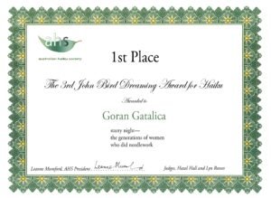 Daruvarčanin Goran Gatalica je na 3. međunarodnom natječaju za haiku koji je održan u Australiji zaslužio prvu nagradu – John Bird Dreaming Award. Na natječaju je sudjelovalo 260 haiku pjesnika iz više od 40 zemalja svijeta.