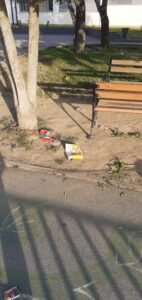 Na fotografijama koje nam je poslao mogu se vidjeti odbačene plastične čaše kako leže na tlu oko dvije klupe, uokolo razbacana razna ambalaža, tu i tamo izgužvana kutija cigareta, potrgane grane stabala koje krase okoliš škole i metalni stup na kojem se vjerojatno nalazio koš za smeće.