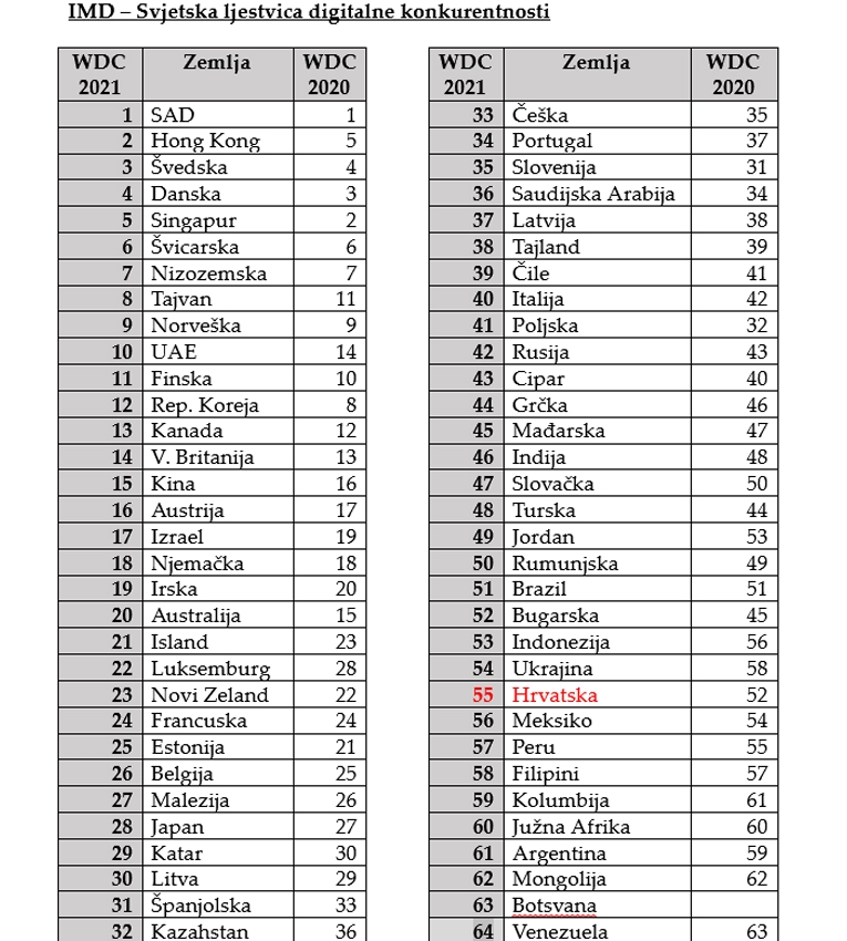 Institut za razvoj poslovnog upravljanja (IMD) iz Lausanne, čiji je partner-institut Nacionalno vijeće za konkurentnost, objavio je rezultate izvješća “IMD – Svjetska ljestvica digitalne konkurentnosti 2021.”.