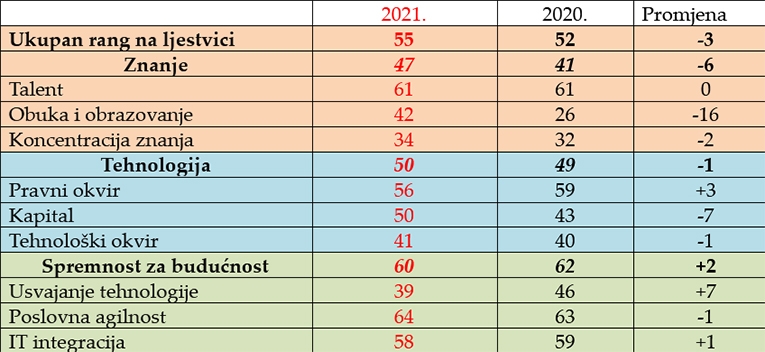 Hrvatska je ove godine zauzela 55. mjesto od ukupno 64 vodeće svjetske ekonomije, što je pogoršanje pozicije za tri mjesta u odnosu na prošlu godinu. Najbolje smo pozicionirani u stupu znanja (47. na ljestvici), a najlošiji u spremnosti za budućnost (60. na ljestvici).