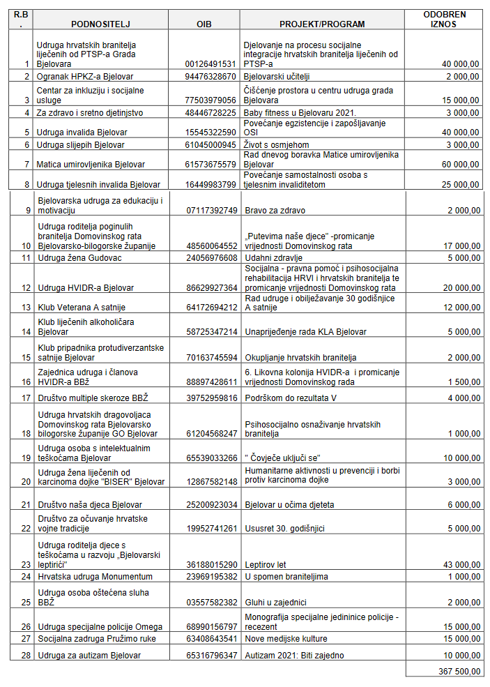 Grad Bjelovar ovih je dana donio Odluku o raspodjeli financijskih sredstava programima i projektima za udruge s područja Grada iz programa socijalno –zdravstvenih potreba, javnih potreba u školstvu i branitelja za 2021. godinu.
