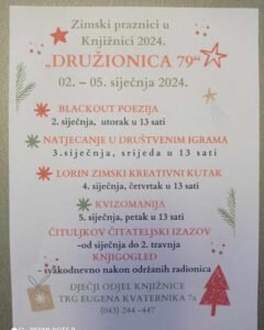 Riječ je o tematski osmišljenim radionicama u kojima će svatko pronaći ponešto za sebe. Uz današnju Blackout poeziju te sutrašnje natjecanje u društvenim igrama, klinci i klinceze u četvrtak mogu sudjelovati u Lorinom zimskom kreativnom kutku koji će voditi Lora Kalem, dok je petak je rezerviran za Kvizomaniju.