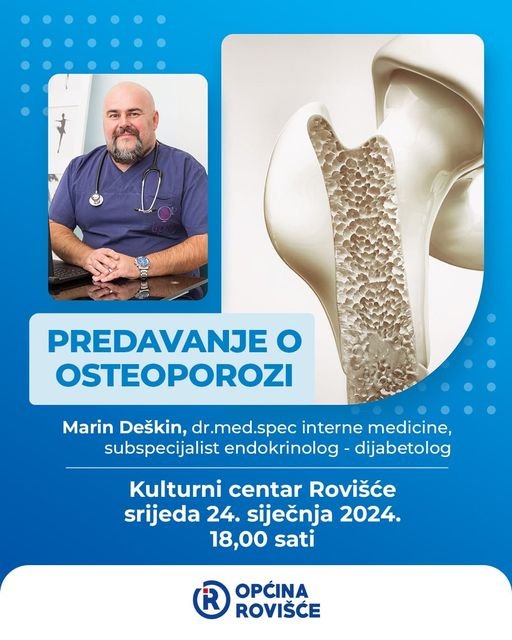 -O prevenciji, dijagnostici i liječenju osteoporoze govorit će vrhunski stručnjak Marin Deškin, dr. med. spec. interne medicine, supspecijalist endokrinolog-dijabetolog od kojeg ćete dobiti ključne informacije i savjete kako biste mogli bolje razumjeti ovu podmuklu bolest te naučiti kako očuvati snagu svojih kostiju – poručuju iz Općine Rovišće koja je organizator ovog hvale vrijednog predavanja za koje je ulaz slobodan. (ak)