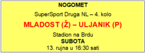 MLADOST – Nogometaši s bjelovarskog Brda zbog brojnih promjena domaćinstava tek će u sedmom kolu putovati u goste i to Hrvatskom dragovoljcu. Četvrto kolo SuperSport druge lige Mladost otvara kao stopostotna u prvenstvu i kao sudionik osmine finala Kup natjecanja u kojem će biti domaćin Rijeci (ukoliko Rijeka pobijedi Maksimir?). Već taj podatak dovoljno govori kako će momčad trenera Dine Babića u sudaru s pulskim Uljanikom biti veliki favorit. Međutim, Uljanik u Ždralove ne dolazi na izlet. U prva tri kola upisao je dvije pobjede, što je sasvim dovoljna garancija da će se na Brdu odigrati sjajna nogometna utakmica koju, na žalost, mnogi ljubitelji nogometa neće vidjeti jer će biti na Gradskom stadionu ili u sportskoj dvorani.