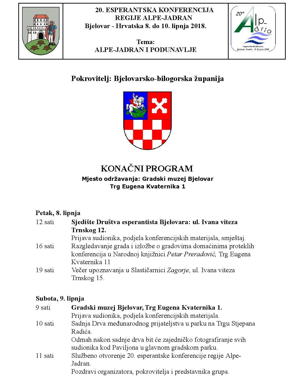 Ova lijepa međunarodna suradnja kreće u petak, no službeni dio zapravo počinje u subotu kada će sudionici u 10 sati posaditi Drvo međunarodnog prijateljstva na Trgu Stjepana Radića, a sat kasnije je službeno otvorenje konferencije u Hotelu Central. Pokrovitelj ove međunarodne konferencije koja bi, između ostalog, sudionicima iz susjednih zemalja usaditi lijepe uspomene na druženje u Bjelovaru, je Bjelovarsko–bilogorska županija. U nastavku pročitajte raspored događanja. (ika)