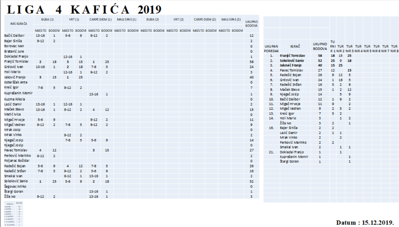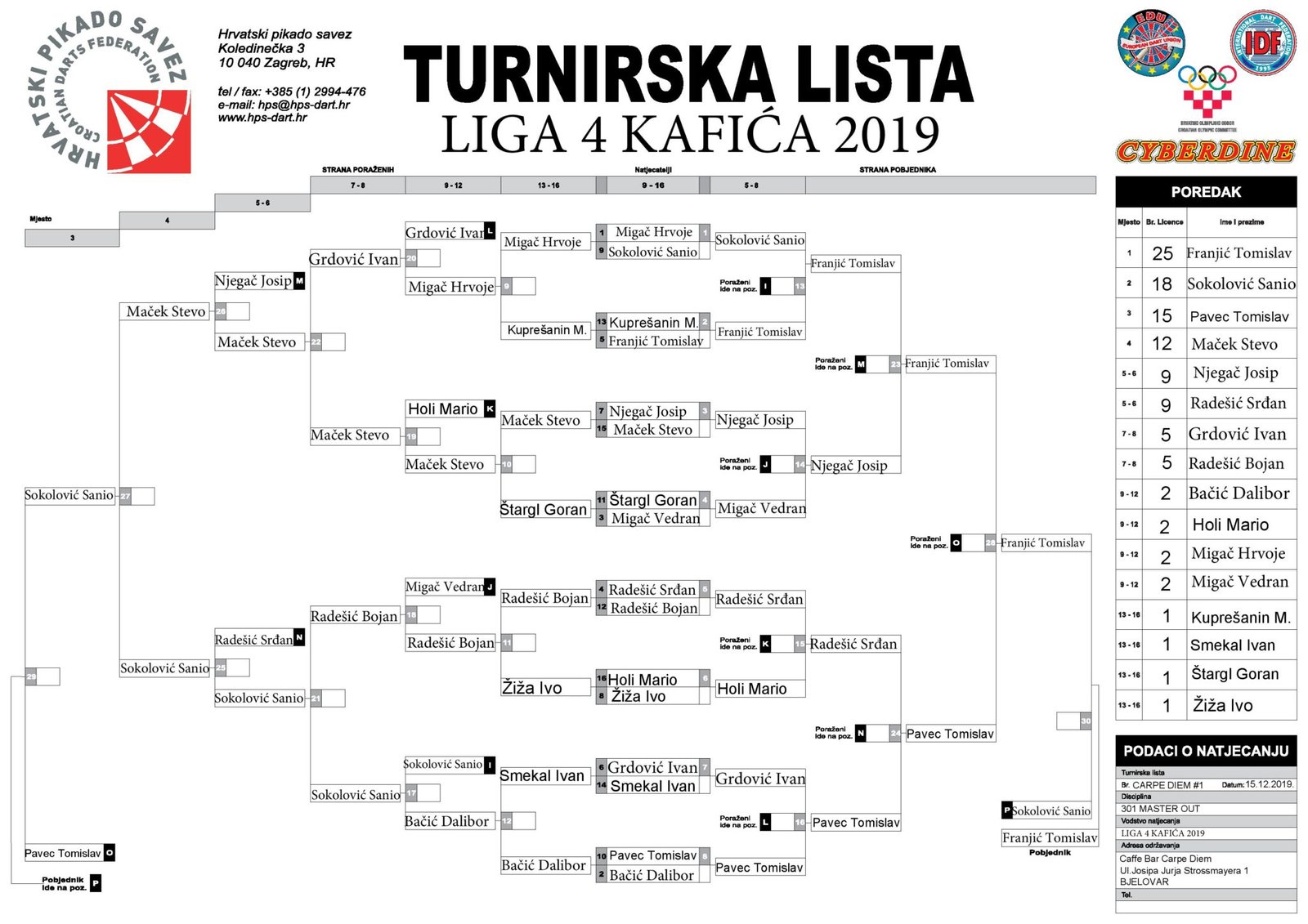 Nakon što su nedavno ustrojili Ligu 4 kafića, ekipa zaluđena pikadom odigrala je i svoj treći turnir u bjelovarskom Caffe baru Carpe Diem. Za razliku od protekla dva turnira koji su igrani subotom, ovaj turnir je odigran u nedjelju što se odrazilo na broj prijavljenih natjecatelja kojih je ovog puta bilo samo 16. No, pozitivno je to što su se natjecateljima priključila dva nova igrača tako da se broj sudionika popeo na 32.