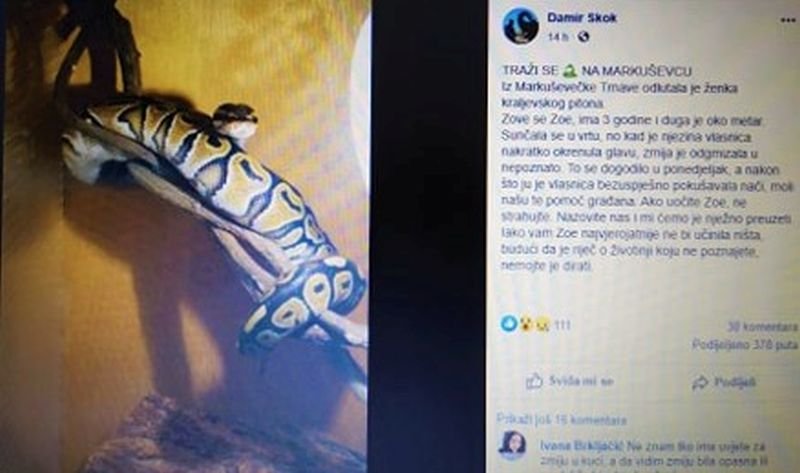 Azil za životinje u Dumovcu objavio je na Facebooku da je iz Markuševečke Trnave na istoku Zagreba odlutala ženka kraljevskog pitona, a potraga je objavljena i u Facebook grupi ”Vaš ljubimac” koja broji gotovo 27 tisuća članova.