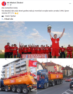 NK Mladost iz Ždralova danas je na svojoj službenoj internetskoj stranici kluba objavila staru fotografiju otprije devet godine kada je njihova momčad upravo na današnji dan, 26. svibnja, osvojila naslov prvaka 3. HNL sjever u sezoni 2011./12.