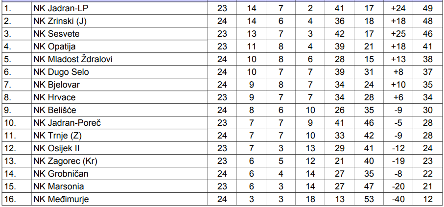 U ostalim susretima 24. kola nije bilo velikih iznenađenja. Vodeći Jadran LP na gostovanju u Hrvacama upisao je poraz rezultatom 1:0, Sesvete na gostovanju u Poreču nisu dozvolile iznenađenje tako što su upisale pobjedu rezultatom 0:2, dok Opatija svoj susret u Krapini igra sutra.