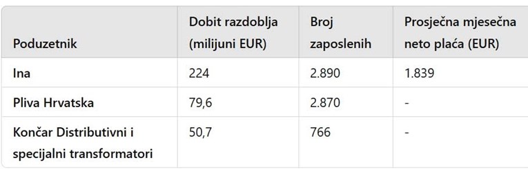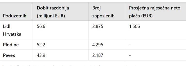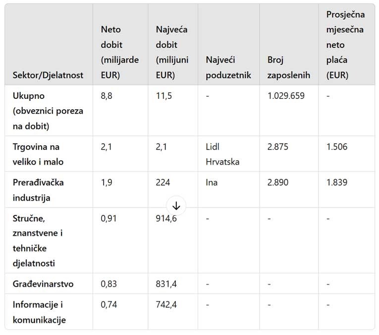 Najveća neto dobit ostvarena je kod poduzetnika u trgovini na veliko i malo, u iznosu od 2,1 milijardu eura. Na drugom su mjestu poduzetnici prerađivačke industrije s 1,9 milijardi eura, a na trećem poduzetnici u stručnim, znanstvenim i tehničkim djelatnostima, s 914,6 milijuna eura.