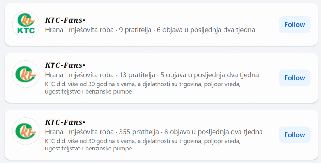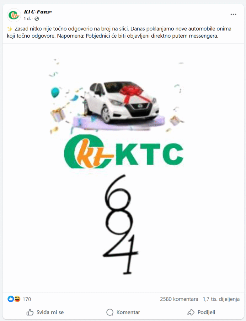 Lažne stranice na Facebooku se predstavljaju kao KTC pod nazivom ”KTC fans” i objavljuju lažne nagradne igre.