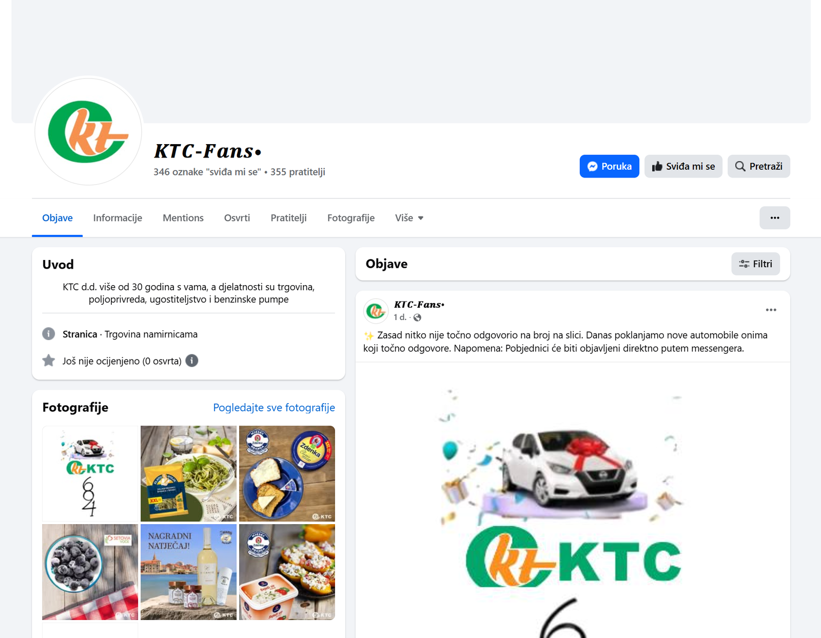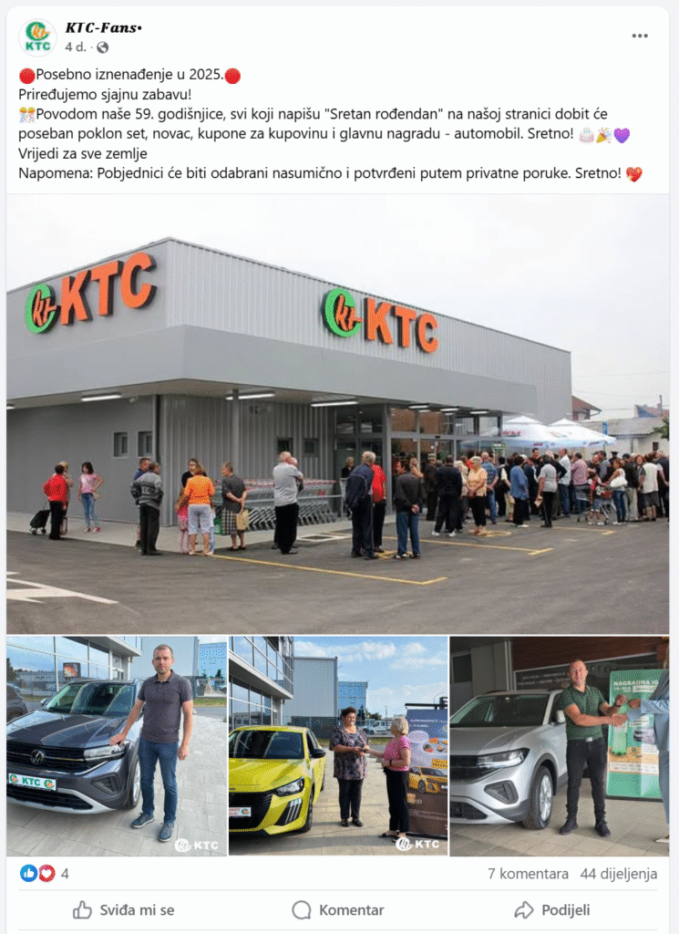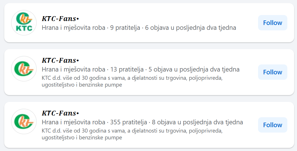 – Obavještavamo vas o pojavi lažnih Facebook profila koji se predstavljaju kao KTC i objavljuju lažne nagradne igre. KTC d.d. nije povezan s takvim profilima, niti s navedenim aktivnostima. Molimo vas da ne šaljete svoje osobne podatke i da imate na umu da je jedina službena Facebook stranica na sljedećem linku: www.facebook.com/ktchrvatska.