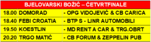 Tradicionalni 45 po redu malonogometni turnir “Bjelovarski Božić” ulazi u svoju završnicu. U borbi za naslov najbolje ekipe, što osim bogate novčane nagrade u iznosu od šest tisuća eura donosi i laskavu titulu bjelovarskog vladara malog nogometa, ostalo je osam najboljih ekipa od kojih svaka može biti prva, međutim, samo će četiri od njih osjetiti draž igranja u polufinalu. Mjesto u četvrtfinalu izborile su ekipe: Domorad, OPG Vidojević &CB Carica, Febi Croatia, BTP S-Line automobili, Koestlin, MD Renta a car & Trgovački obrt, Trgo Matić i ekipa CB Forum & Zeppelin pub.
