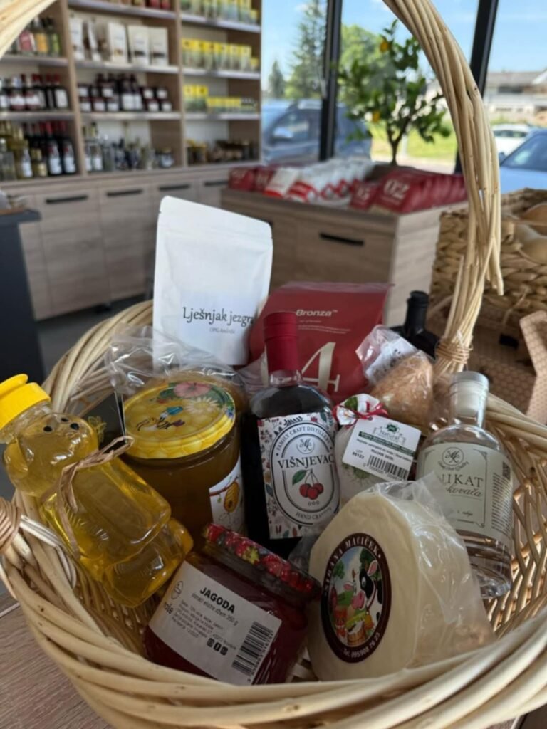 Na policama se nalazi bogat i pažljivo odabran asortiman: svježi sirevi, domaća jaja, sočne jabuke, zlatni med, brašno iz domaćih mlinova, ručno rađena tjestenina, domaći sokovi, likeri, džemovi, čajevi i orašasti plodovi. Svaki proizvod nosi pečat kvalitete i priču vrijednih ljudi koji su ga proizveli.