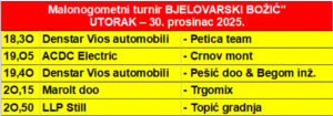 Danas, 30. prosinca, po rasporedu igraju se novih pet susreta. Po prvi puta predstaviti će se zagrebačka ekipa Denstar Vios automobili koja je jedan od favorita turnira i koja će dana odigrati dvije utakmice, dok će ekipe ACDC Electric i Crnov mont odigrati svoju zadnju utakmicu u skupini.