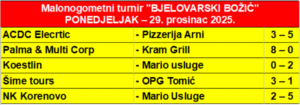 Na malonogometnom turniru “Bjelovarski Božić” održan je četvrti dan igranja po skupinama u seniorskoj konkurenciji. Odigrano je novih pet utakmica nakon kojih su ekipe: Palma & Multi Corp, Mario Usluge i Pizzerija Arni, s dvije dosadašnje pobjede iz dvije odigrane utakmice već praktično osigurale prolaz u nokaut fazu.