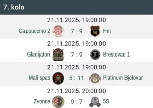 Najveći derbi 7. kola pripao je Platinum Bjelovaru, koji je na gostovanju svladao Mali spas uvjerljivim rezultatom 11:5. Iako su domaćini ušli motivirano i borbeno, Platinum je pokazao širinu i stabilnost u svim mečevima. Mali spas je najviše vukao Migač, jedini u ekipi s pozitivnim omjerom, no to nije bilo dovoljno za ravnopravniji rezultat.