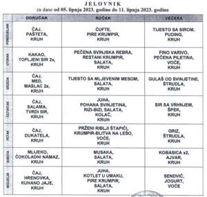 Na meniju za ručak u utorak našla su se pečena svinjska rebrica, restani krumpir, salata, kruh… i tako redom sve do nedjelje kada je za ručak planiran kotlet u umaku poslužen uz pire krumpir i salatu.