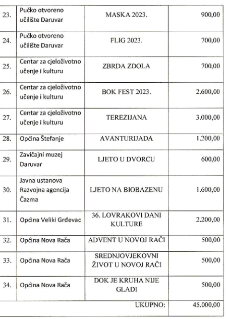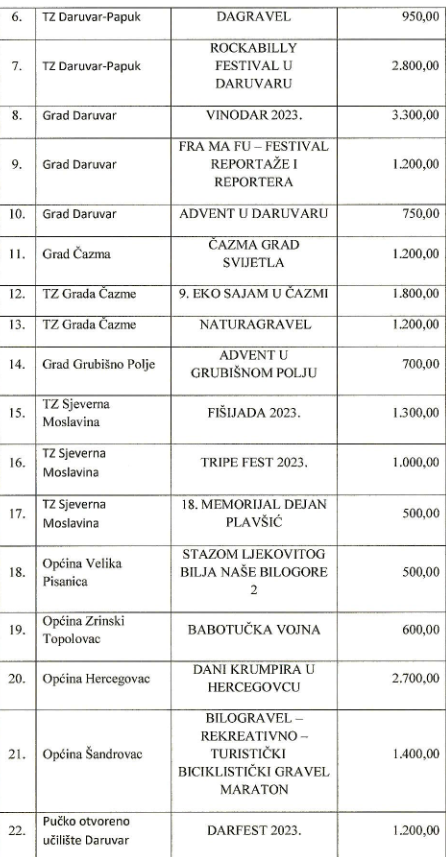 Najviše bodova i novca dobio je daruvarskiVinodar, 3.330,00 eura, potom slijedi bjelovarska Terezijana s 3.000,00 eura te Rockabily festival u Daruvaru s 2.800,00 eura. Kompletan pregled potpomognutih događanja pogledajte u tablici.(dv)