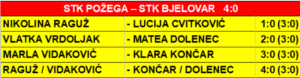 Nikolina Raguž, najbolja stolnotenisačica Požege koja u sedam odigranih mečeva ove jeseni ima svih sedam pobjeda, bila je nedodirljiva u prvom meču s mladom Lucijom Cvitković, a i Vlatka Vrdoljak, koja je ove jeseni odigrala osam mečeva i upisala svih osam pobjeda, u drugom meču lakoćom se obračunala s Mateom Dolenec. Dobar i neizvjestan meč odigrale su Marla Vidaković i Klara Končar. Sretnijom i spretnijom pokazala se domaća stolnotenisačica koja je nakon tri neizvjesna seta pobijedila s 3:0, čime je i dalje ostala neporažena u prvenstvu.