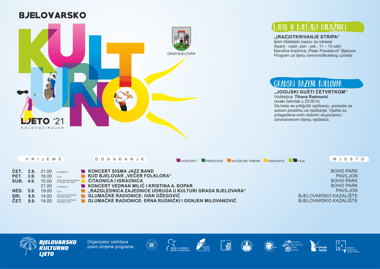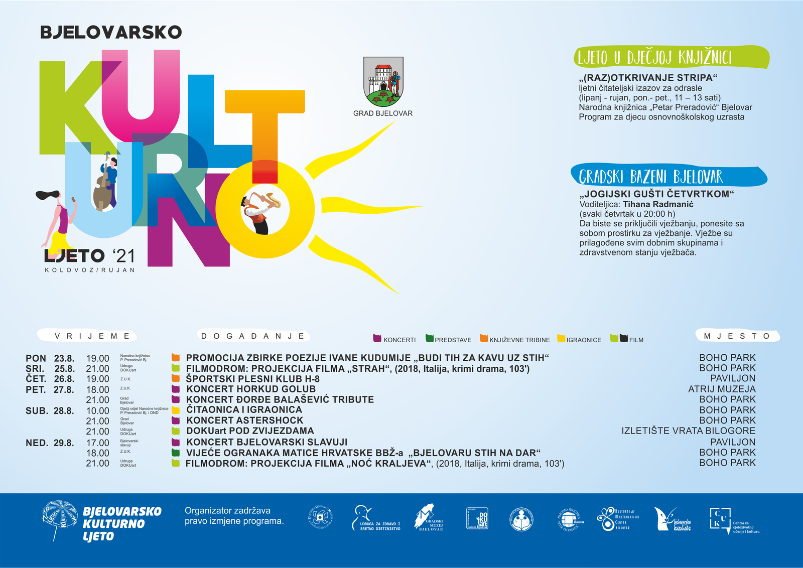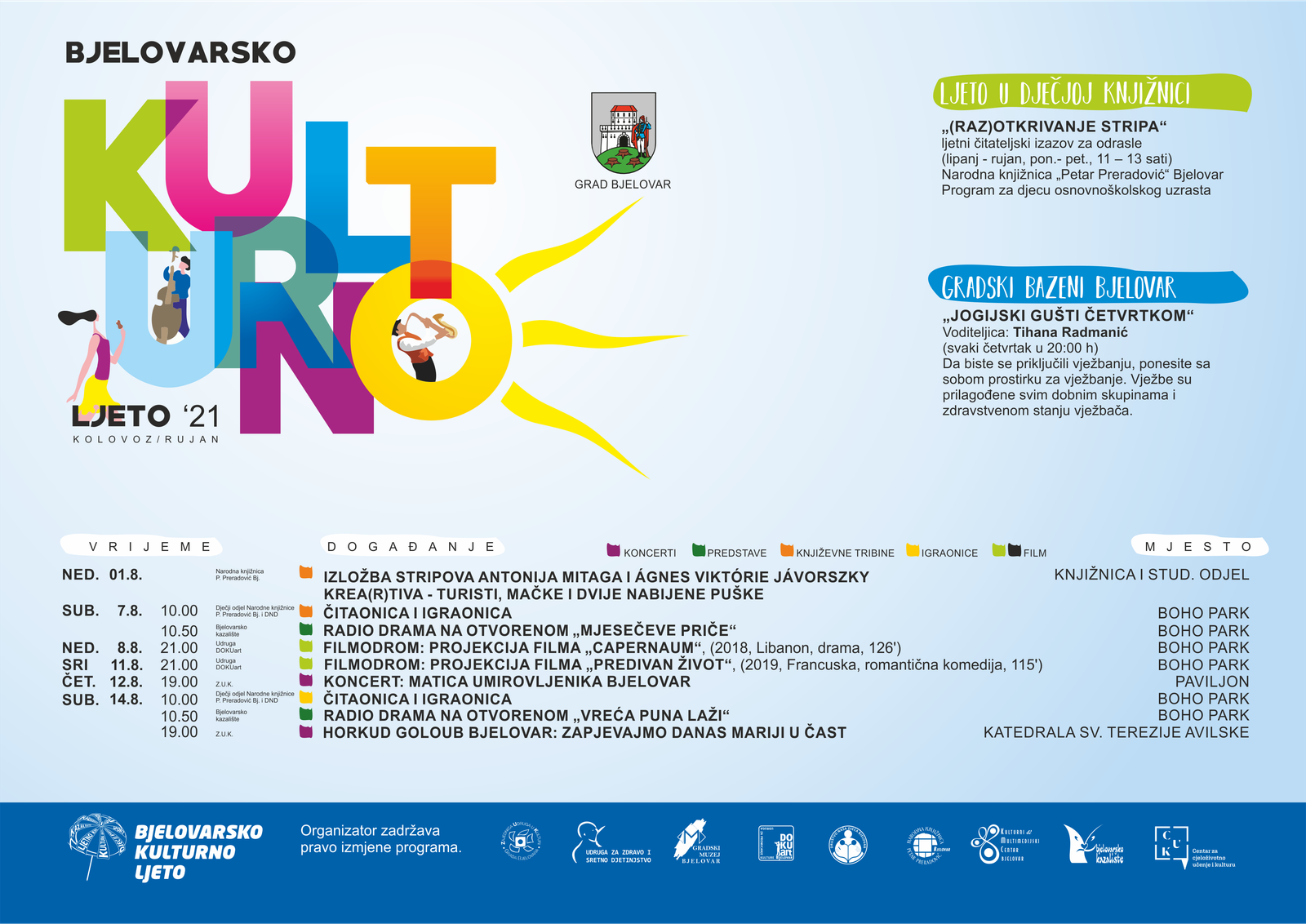 Poznat je program za nastavak Bjelovarskog kulturnog ljeta za kolovoz, no uz napomenu kako je moguća promjena satnice ili termina, ponajviše radi vremenskih prilika.