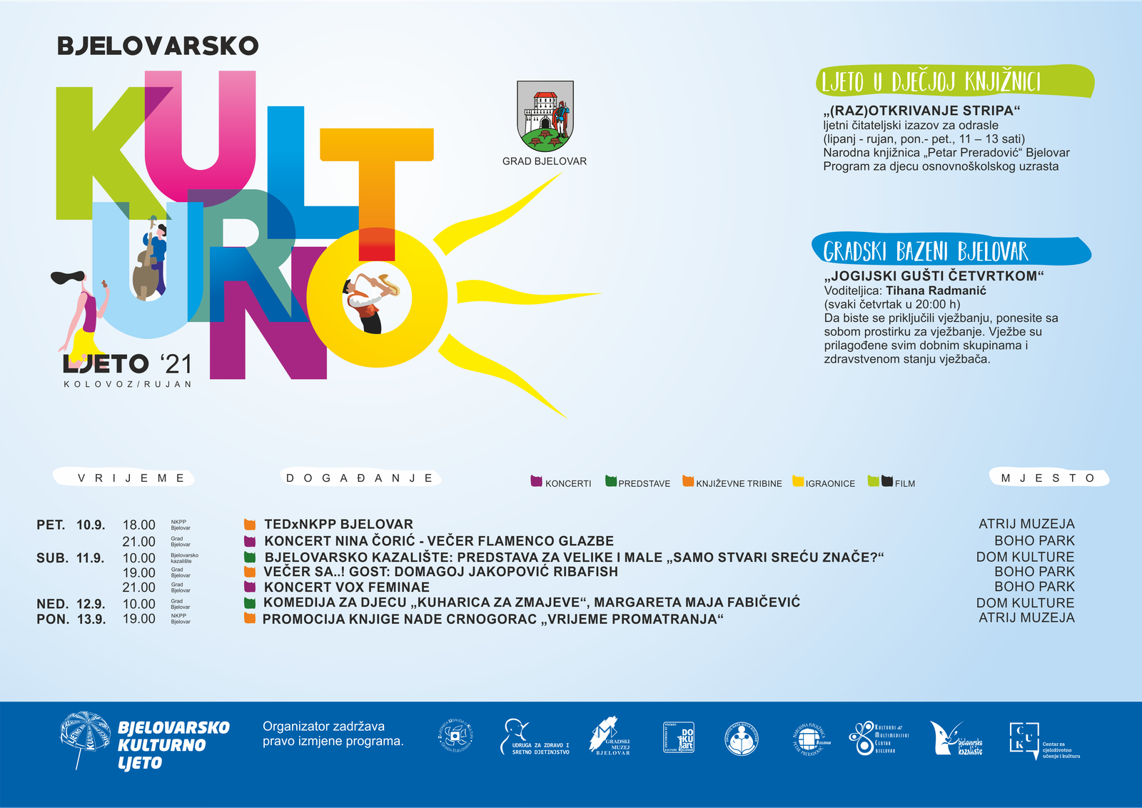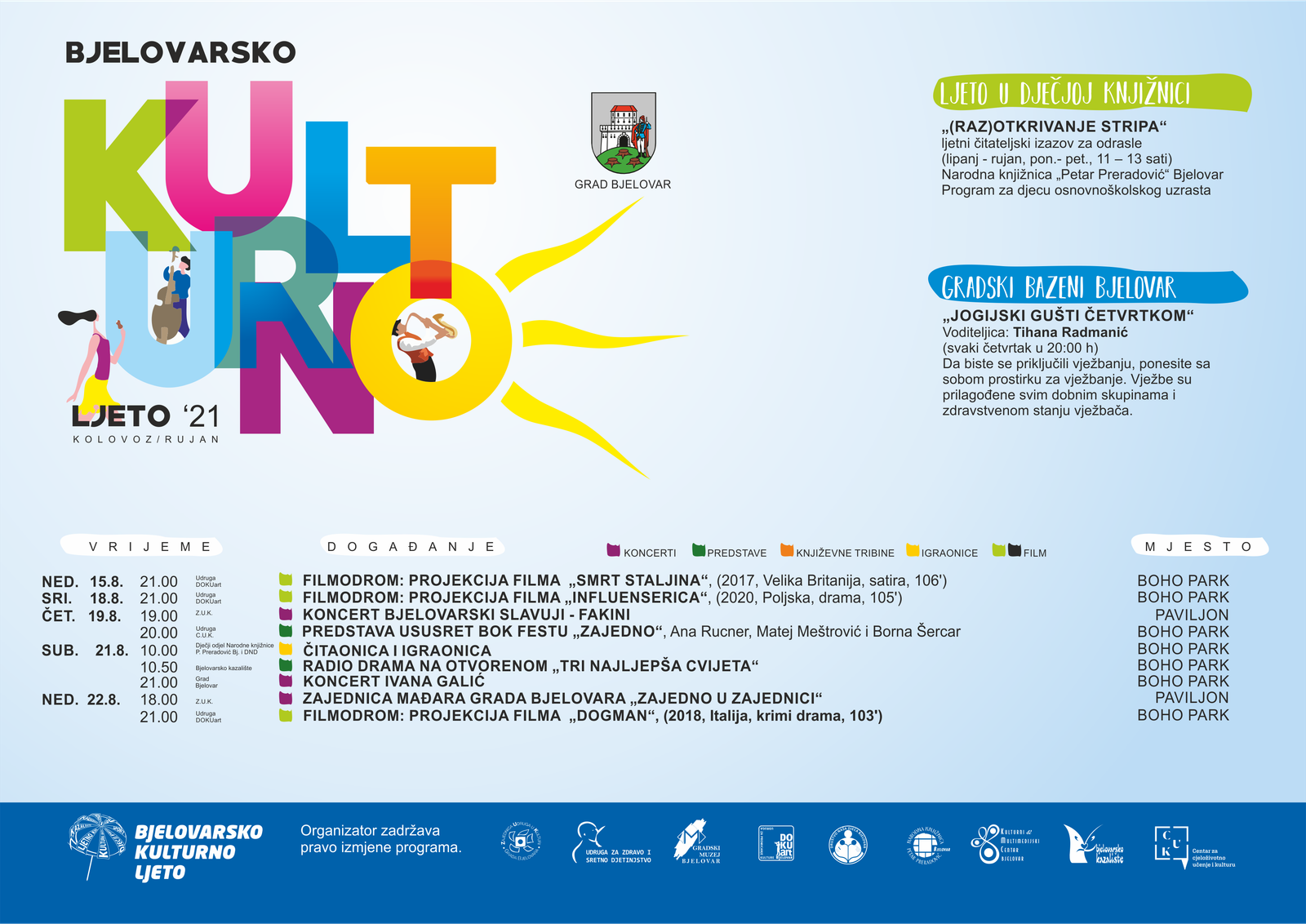 Bit će tu izrazito zanimljivih koncerata, izložbi, projekcija filmova, čitaonica, predstava te još mnogo, mnogo zanimljivih događanja. Kulturno ljetno nastavlja se već za vikend koji je pred nama Čitaonicom i igraonicom za djecu na Dječjem odjelu narodne knjižnice ”Petar Preradović” te radio dramom na otvorenom ”Mjesečeve priče” u režiji Bjelovarskog kazališta.