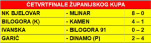Pored NK Bjelovara koji je rezultatom 8:0 kao domaćin pobijedio Mlinar iz Gornjih Sređana, saznali smo i ostala tri kluba koja će igrati u polufinalu kupa Nogometnog saveza Bjelovarsko – bilogorske županije. To su Bilogora 91 iz Grubišnog Polja, Dinamo iz Predavca i Bilogora iz Kapele.